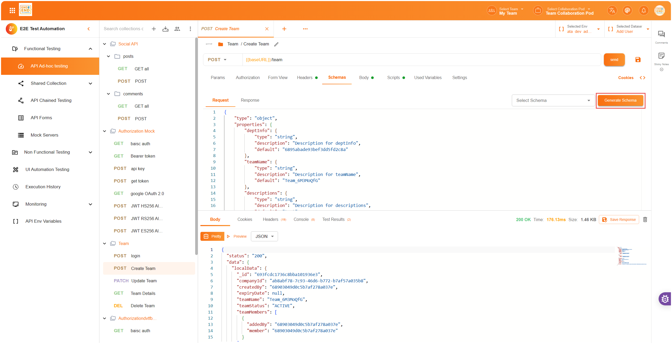 - Click on “Generate Schema” – Once in the Schema tab, click on the “Generate Schema” button. E2E Test Automation will analyze the request body and generate a schema based on its structure