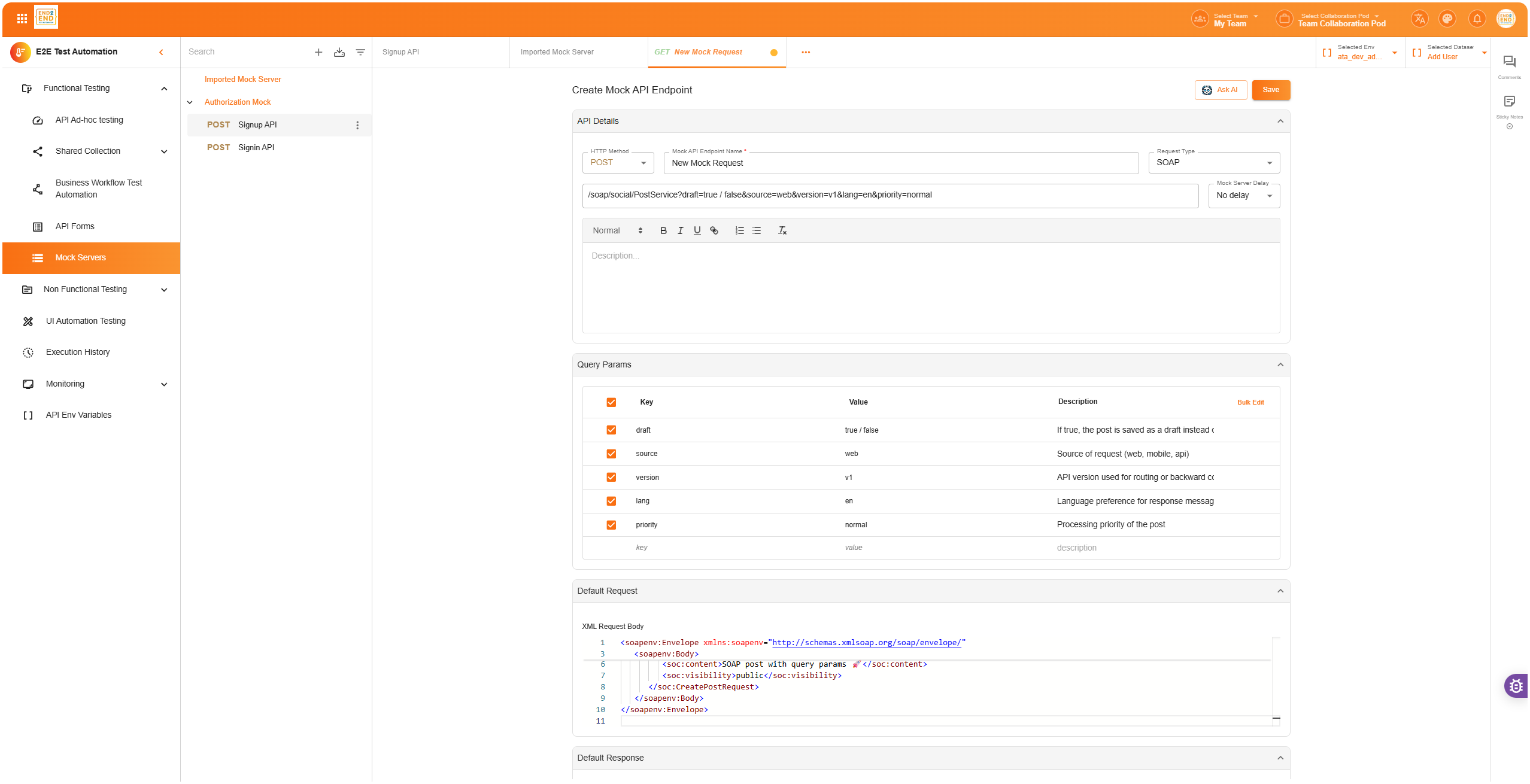 Mock Servers let you simulate REST and SOAP APIs without needing the real backend. Teams can: