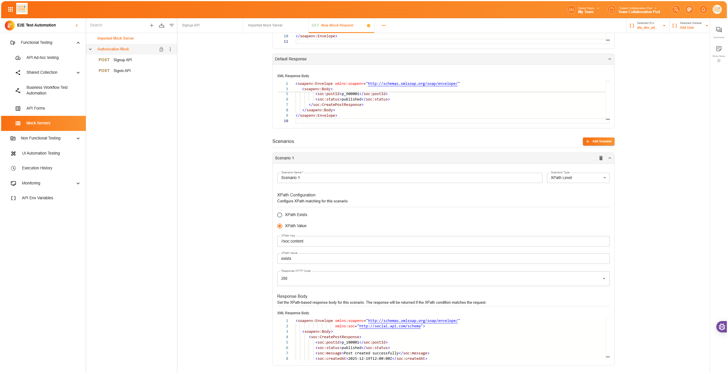 - Configure request bodies, responses, query params, XPath rules, and status codes